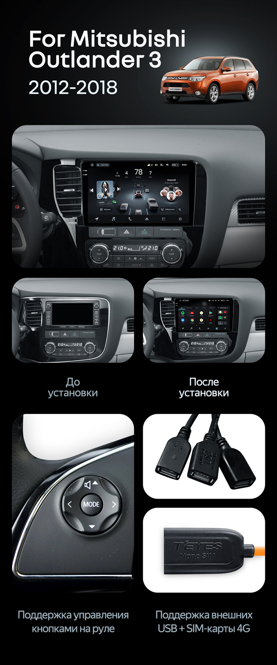 Штатная магнитола Teyes CC4 Pro 12/256 Mitsubishi Outlander 3 (2012-2018) Тип-B - купить всего за 69 100 руб. в интернет-магазине в Череповце Teyes.com.ru. ✓ Самый лучший выбор мультимедиа ✓ Лучшая замена штатному ГУ ✓ Тел. +7 (800) 775-31-74