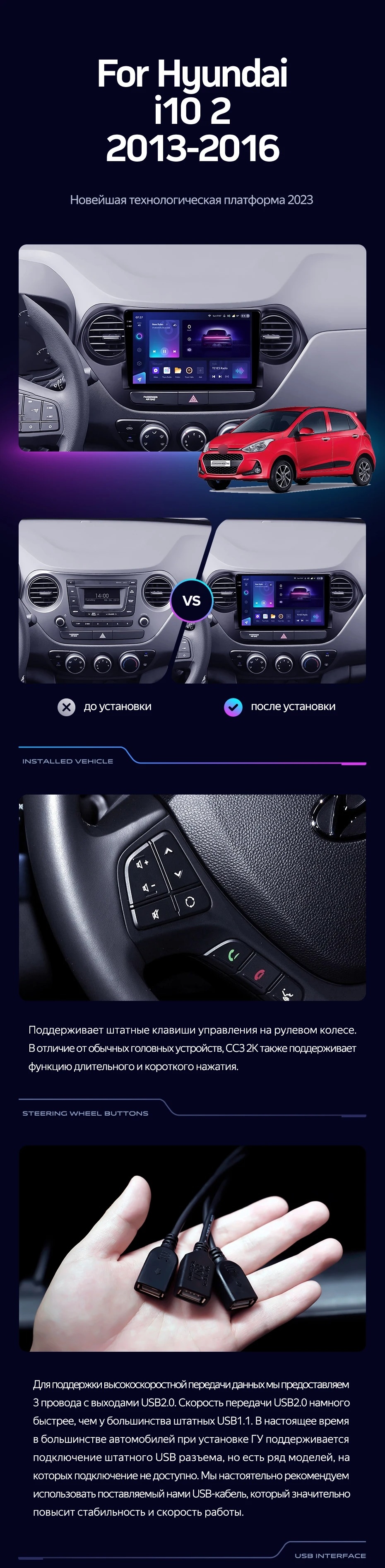 Полный комплект установки магнитолы Teyes с рамкой и проводкой можно выбрать в каталоге штатных магнитол Hyundai i10 (2013-2016).