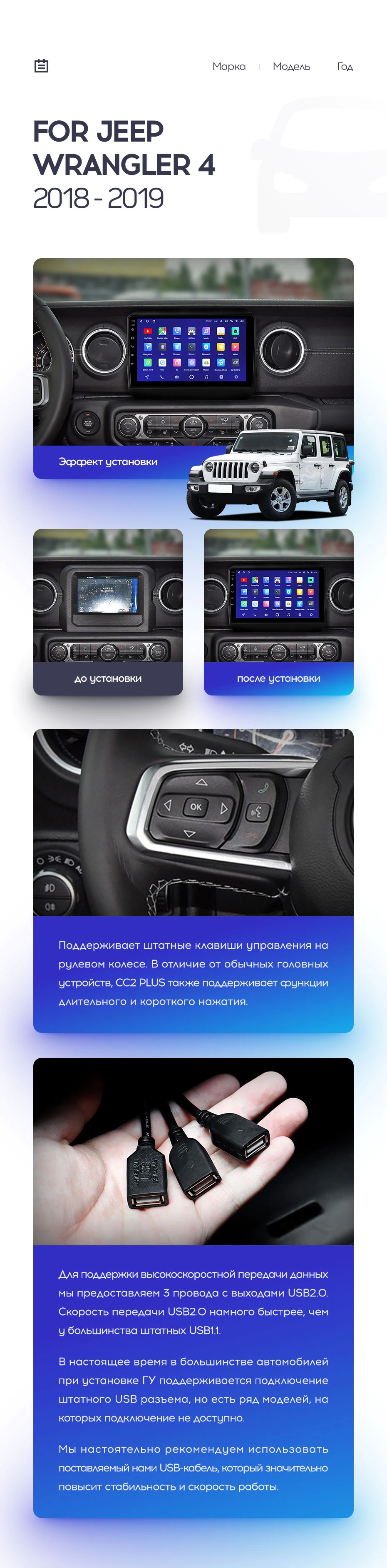 Полный комплект установки магнитолы Teyes с рамкой и проводкой можно выбрать в каталоге штатных магнитол Jeep Wrangler 4 JL (2018-2019).