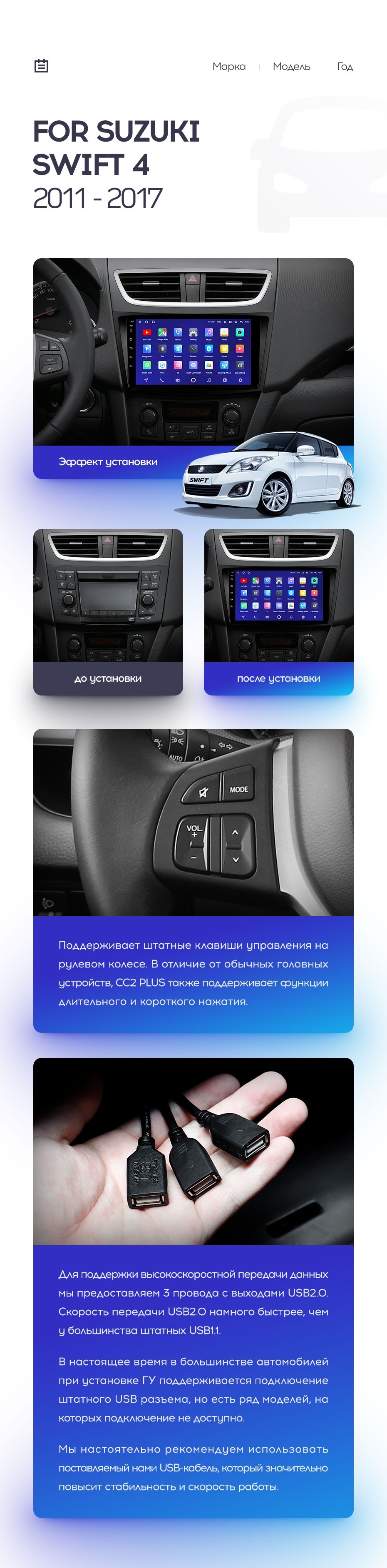 Полный комплект установки магнитолы Teyes с рамкой и проводкой можно выбрать в каталоге штатных магнитол Suzuki Swift 4 (2011-2017).